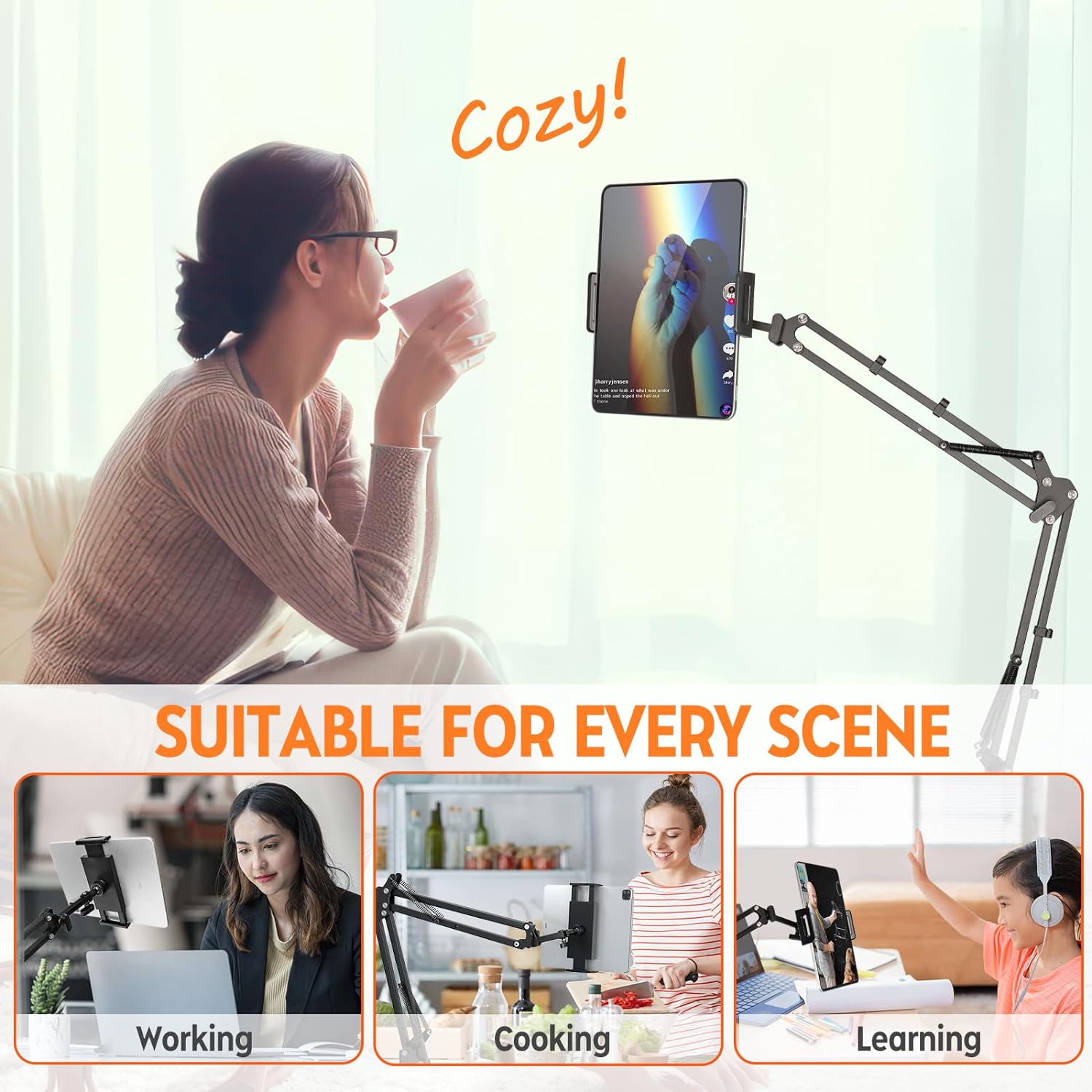 The iPad stand with 4 joints and 360° adjustable ball head allows you to adjust the angle more freely. 6 adjustable nodes to secure your device where you want it, e.g. for relaxing while watching videos, web conferencing and working from home.