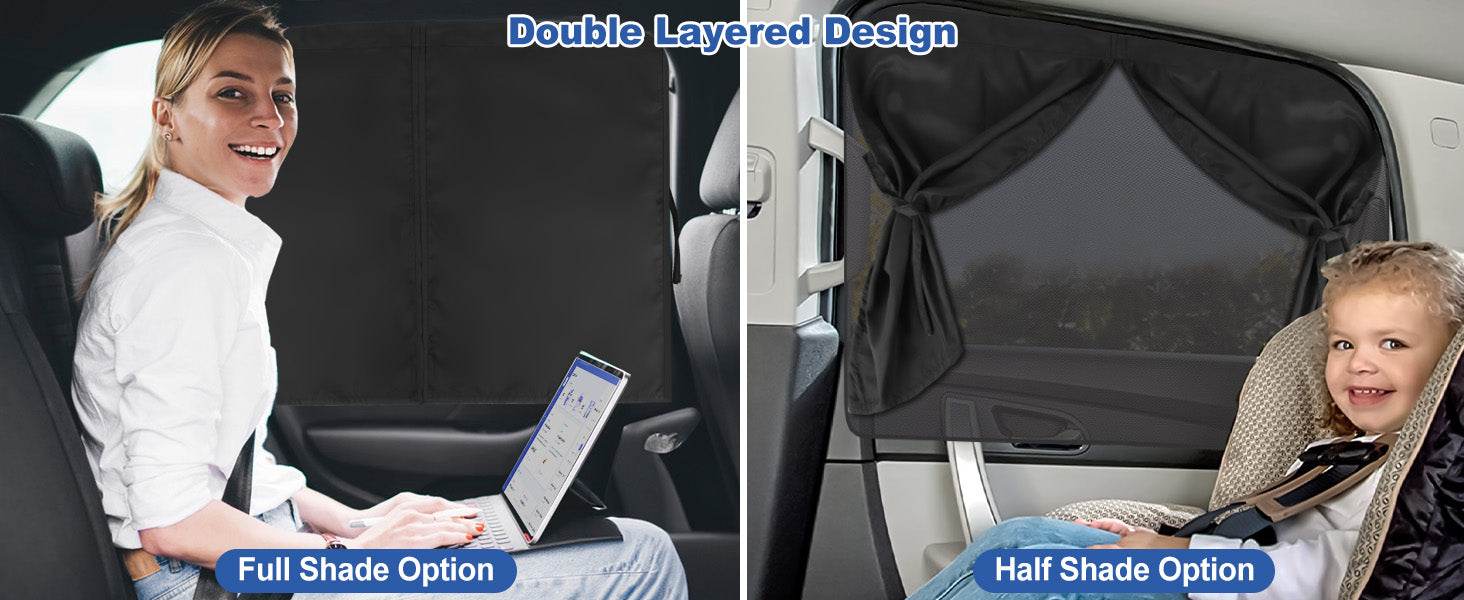 - đăInnovative Double-layer DesignăWith double-layer car sun shades, you can create a private space for resting or breastfeeding. With the straps you can also fold the opaque car sun shades without blocking your view.