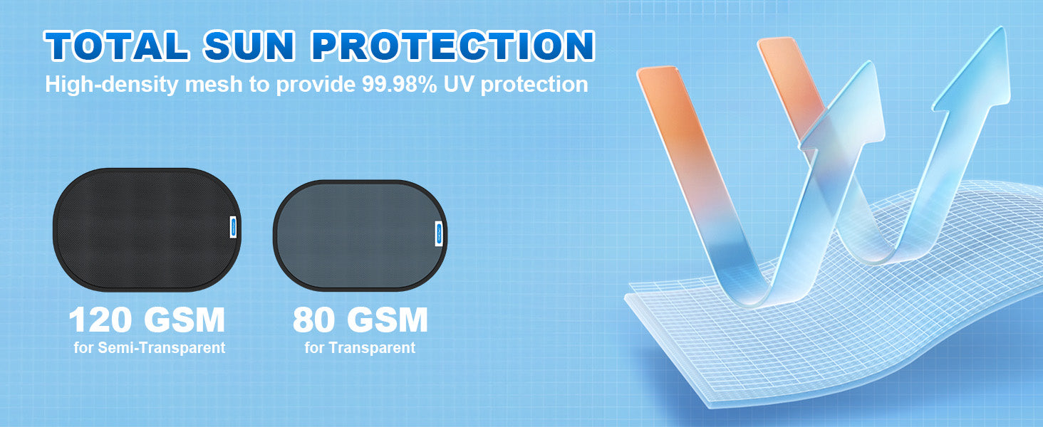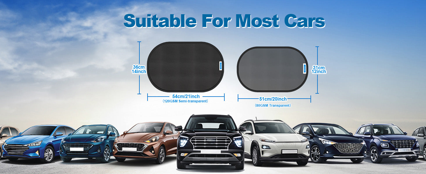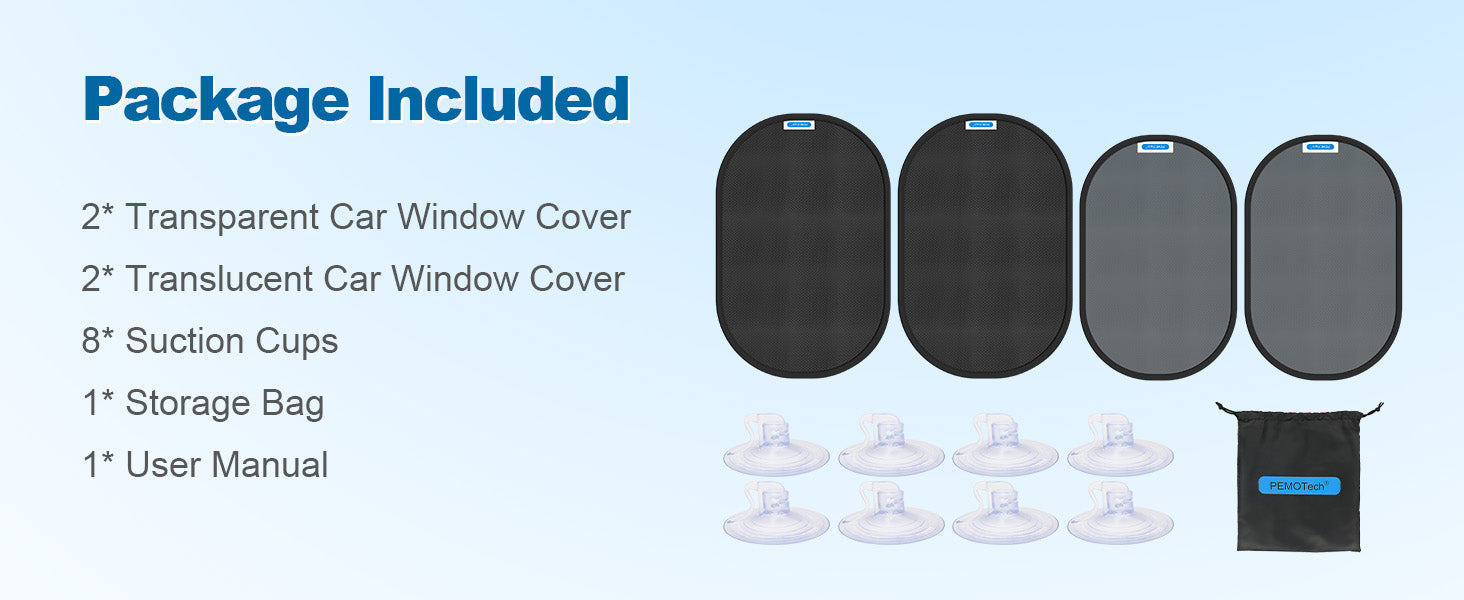 - 【Safety & Visibility】PEMOTech Car Window Shades design with 80 GSM mesh (2pcs 21"x14" Transparent shades) and 120 GSM mesh (2pcs 20"x12" Semi-Transparent shades)compromising safety and visibility without obstructing your view while driving.