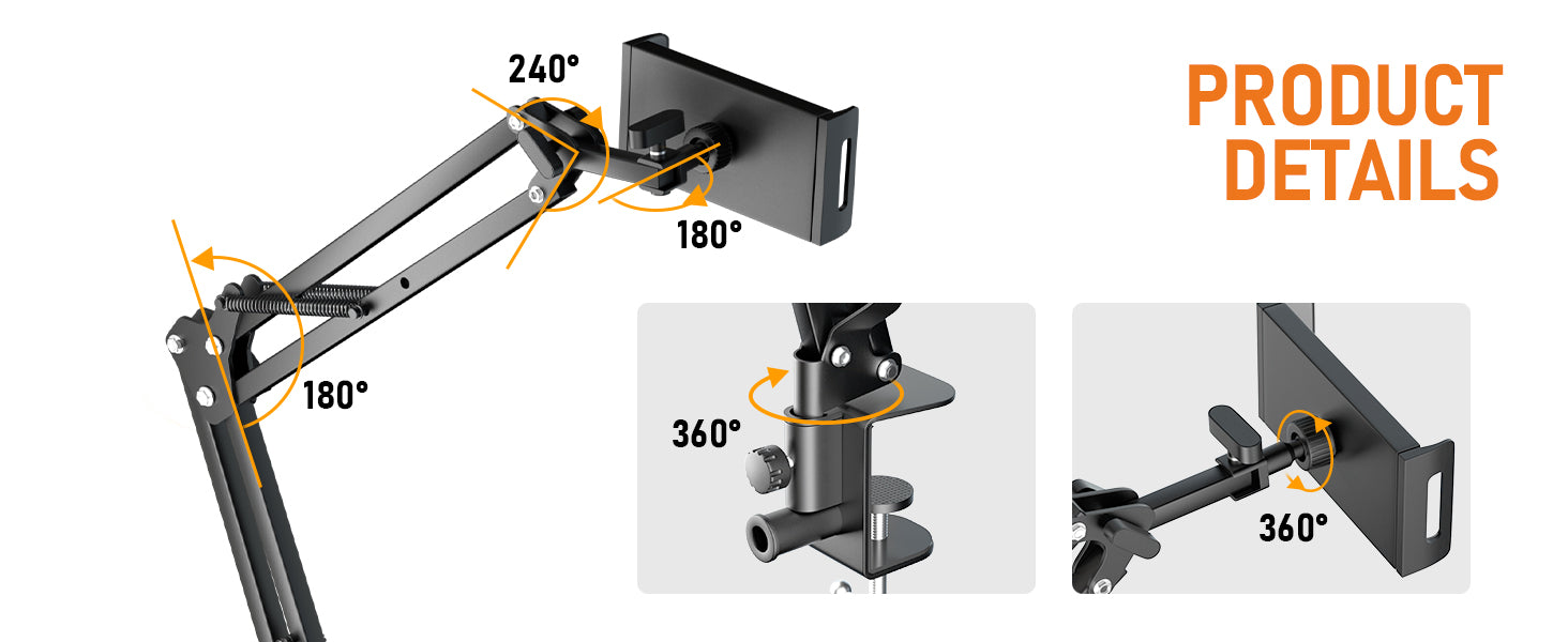 - MULTIPLE ANGLE ADJUSTMENT: The iPad stand with 4 joints and 360° adjustable ball head allows you to adjust the angle more freely. 6 adjustable nodes to secure your device where you want it, e.g. for relaxing while watching videos, web conferencing and working from home.