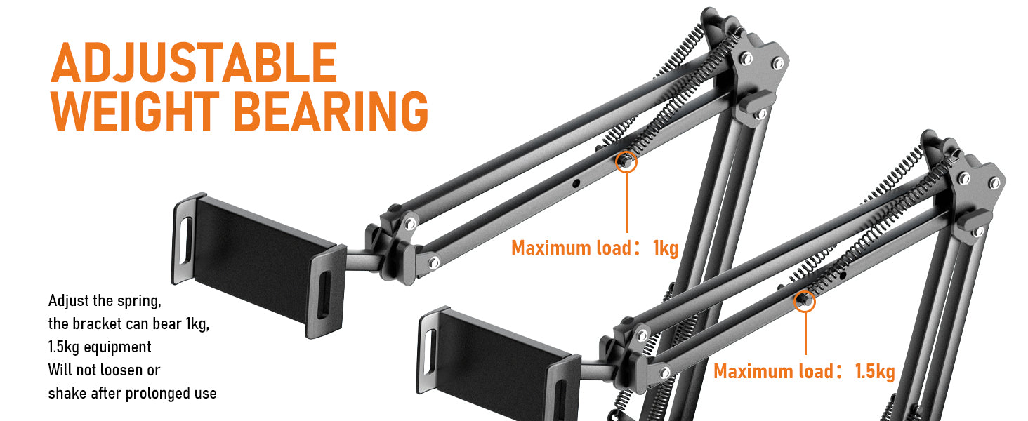 - MATERIAL UPGRADE AND SUPER STABILITY: Equipped with three sections made of high-quality carbon steel bionic mechanical boom, the stability is increased by 100%. iPad holder for bed is equipped with a professional anti-shock spring, which can bear a weight of 1.5 kg, and the support is firm and not sagging. Girls can adjust it with one hand and can comfortably watch movies while lying on the bed.