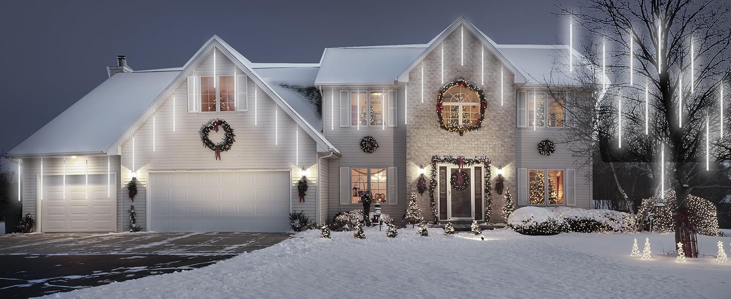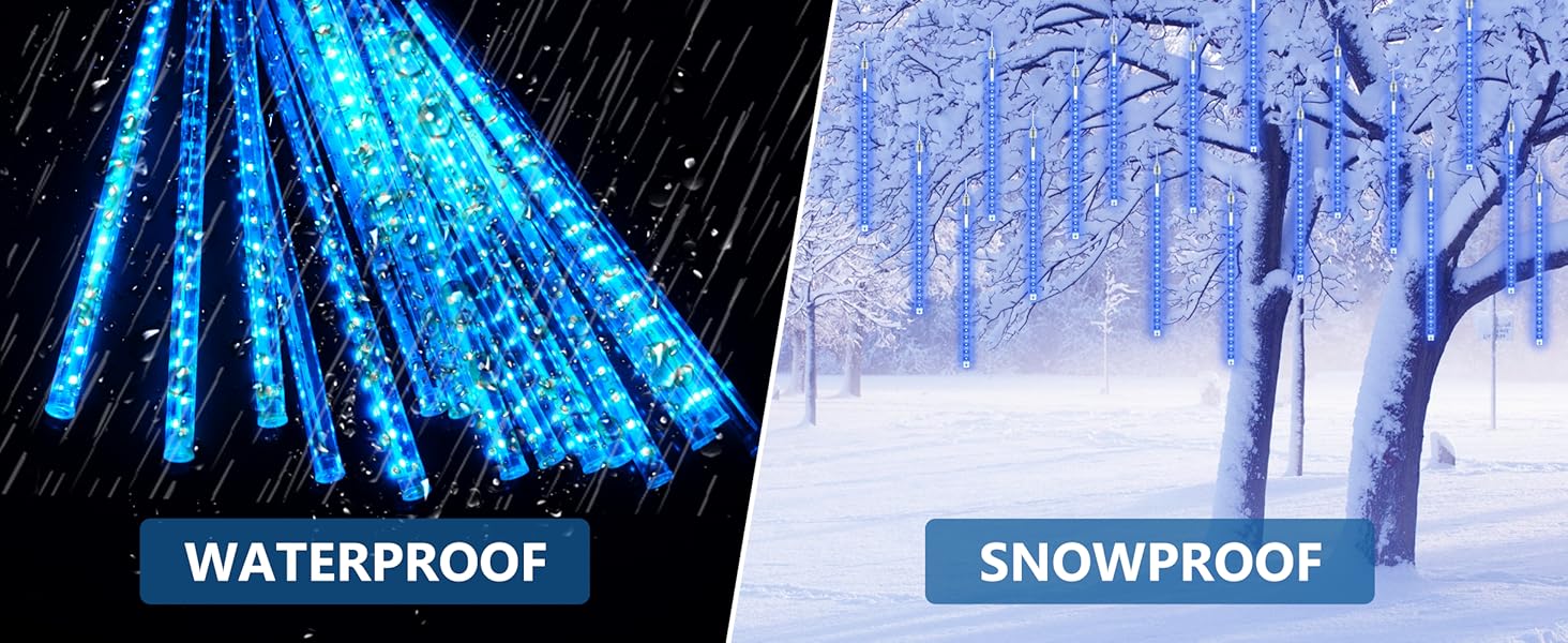 - 【IP65 Waterproof and Brighter LED】This icicle lights has an IP65 waterproof rating, which can withstand rain and snow weather and is very suitable for outdoor use. We use 576 high-quality SMD2835 LED beads to make the meteor lights brighter even at a long distance. Note: Please keep the transformer away from immersion in water.