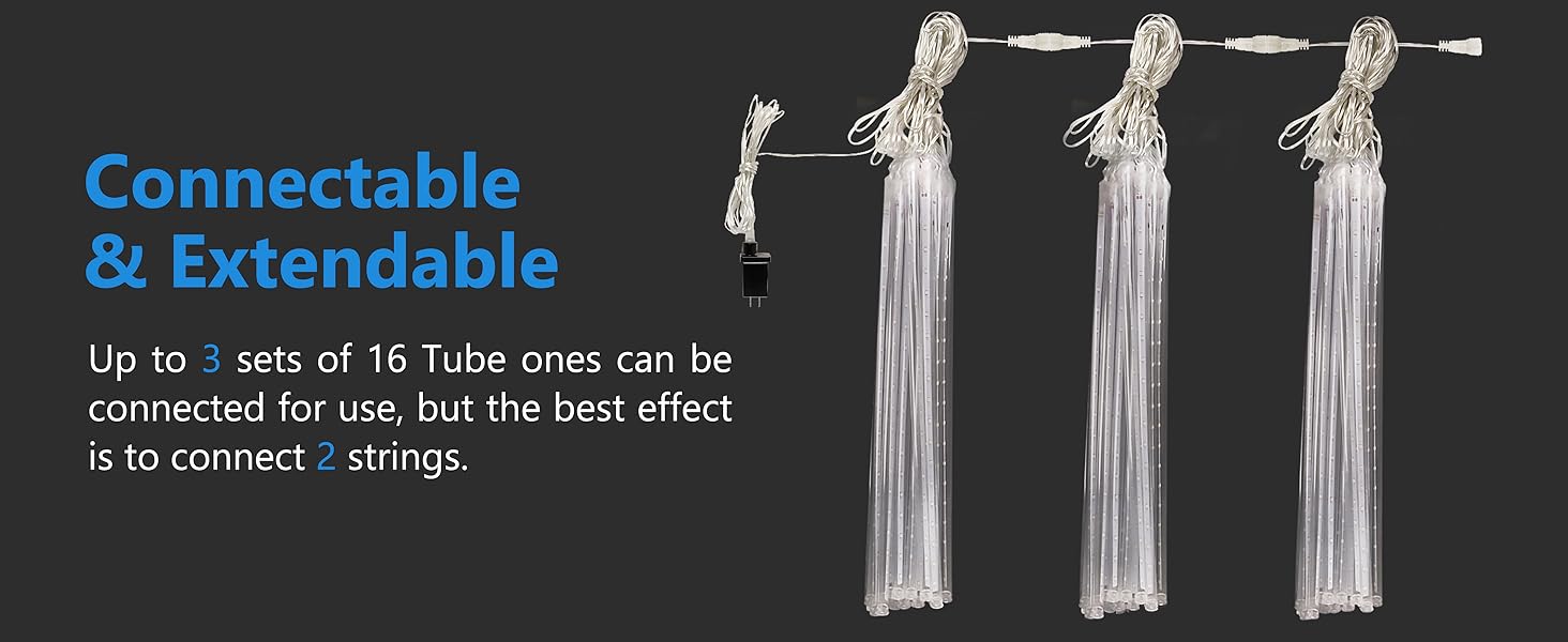 - 【Specifications】Each package contains 1 string of lights and 1 plug. The Rain Lights are equipped with 16 tubes, each tube is 40 cm/15.74 inches long, a total of 576 LEDs, and the lead is 16.4 feet long. The interior of the tube adopts a double-sided design, which can emit light from all angles to meet your needs.