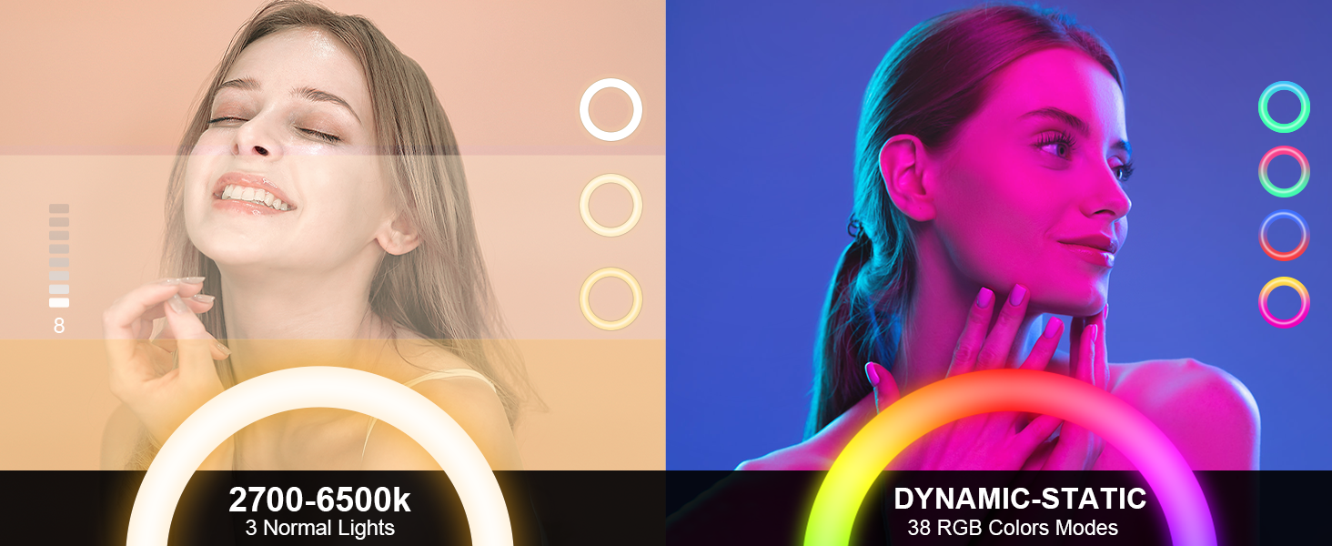 - 【39 Color Modes】Dimmable 12'' ring light featuring 3 lighting modes(warm light/natural light/cool light) Besides, 23 RGB Colors modes(10 monochrome static + 13 dynamic modes) than other brands. Each mode has multi brightness levels, suitable for makeup, photography, Instagram, YouTube, Tiktok short videos, etc.